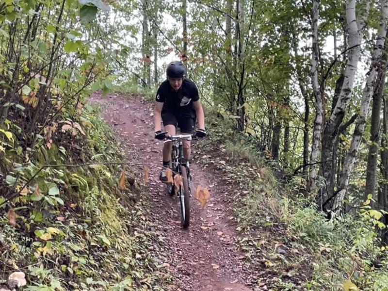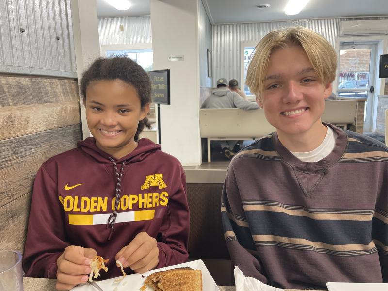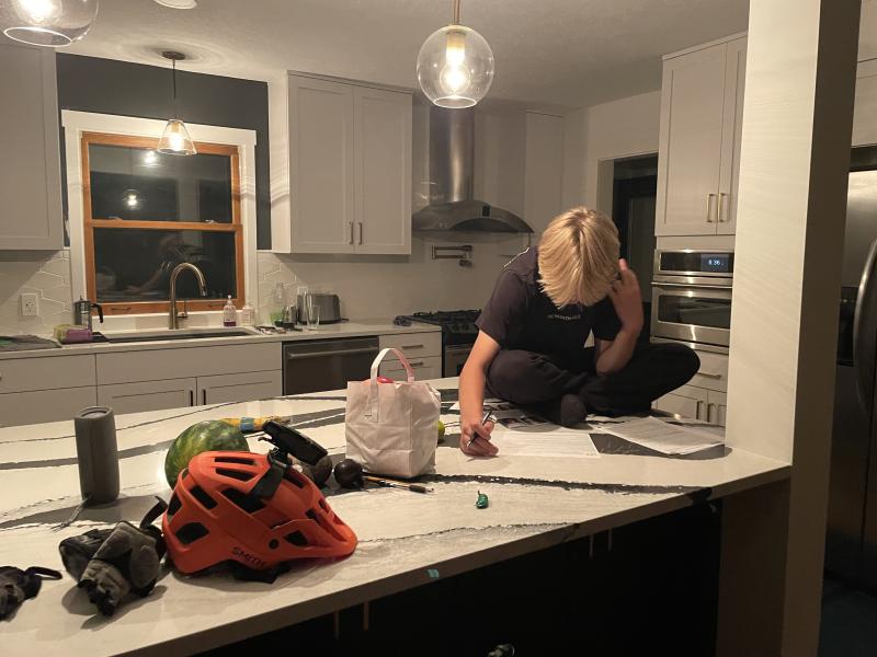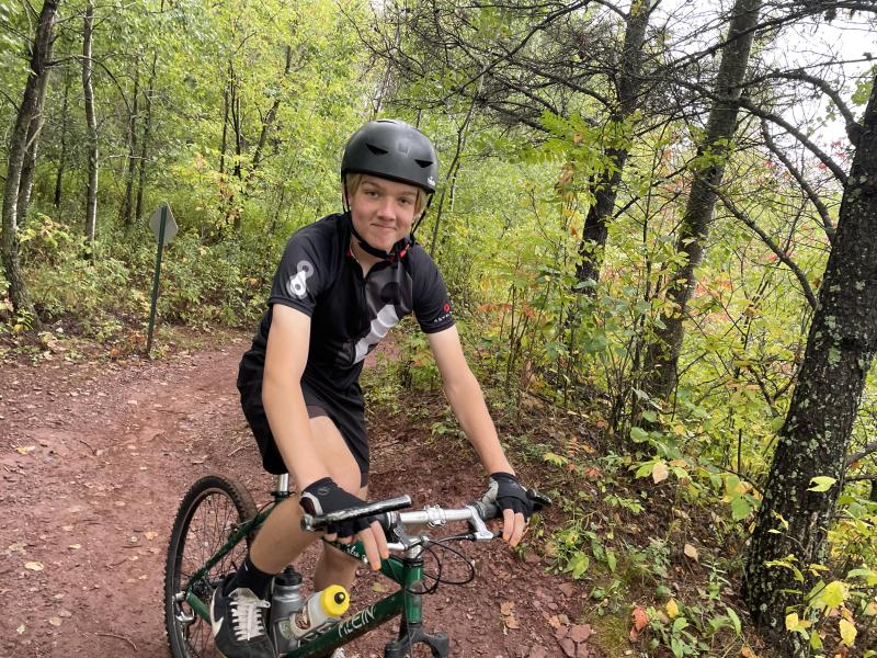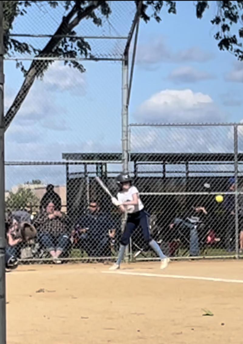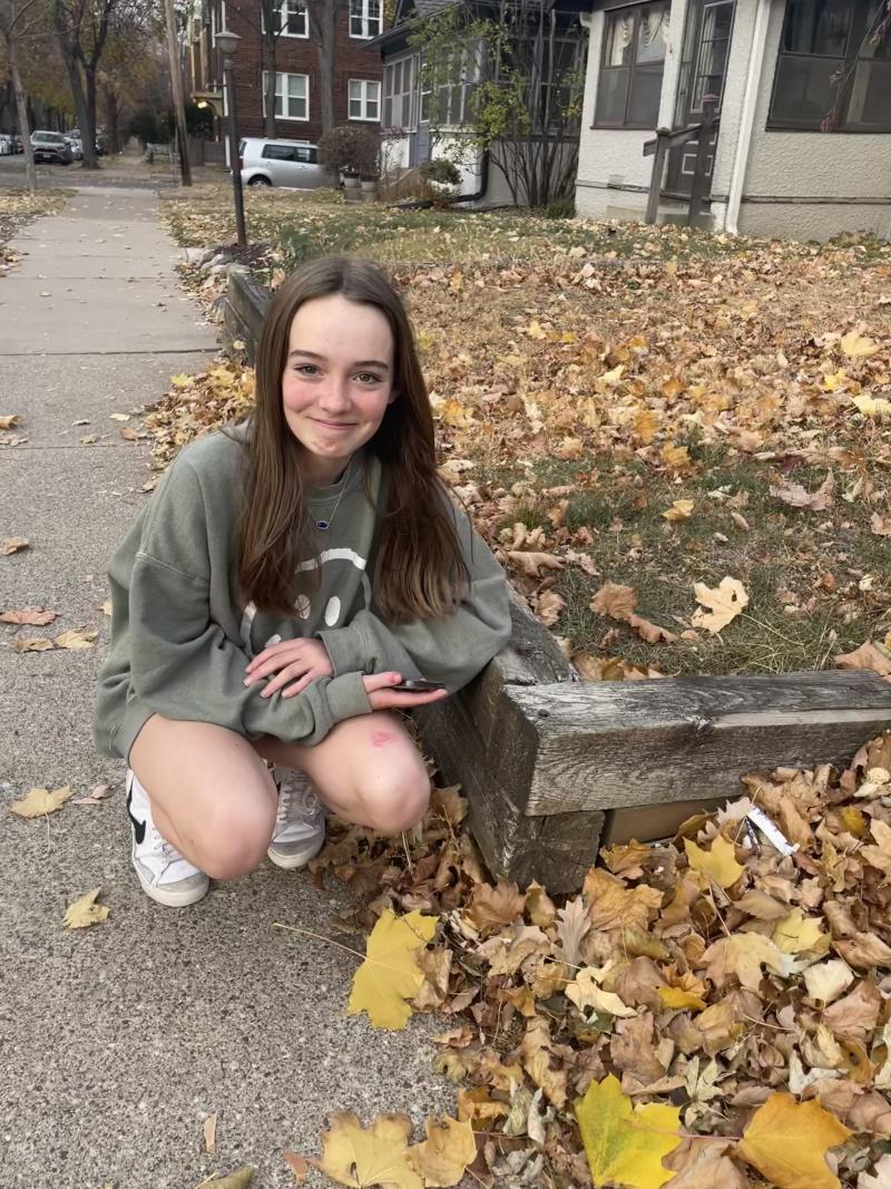 Maya poses by the wood structure she ran into with her bicycle when she was four.