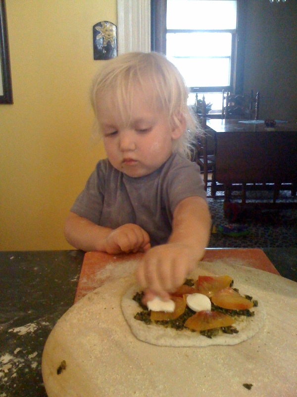 Placing the Hillbilly Potato Leaf tomato on a bed of pesto