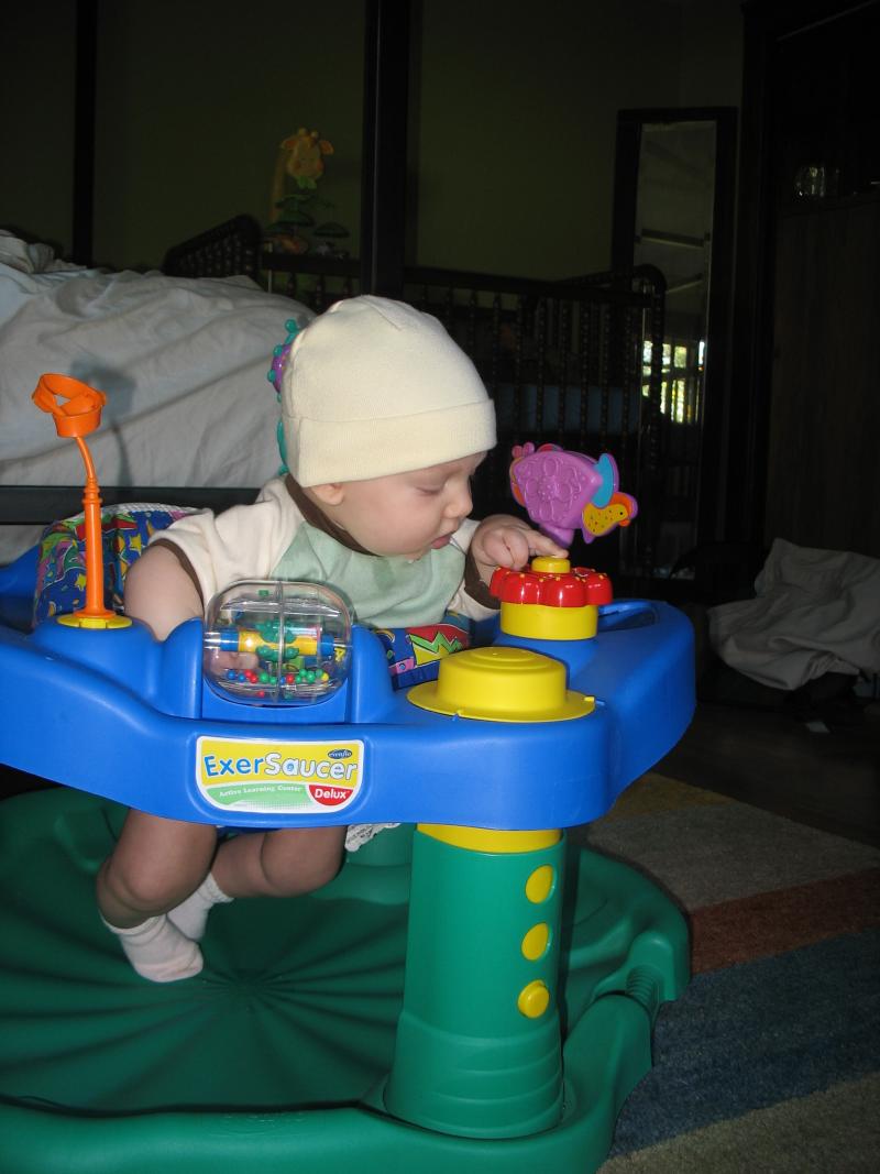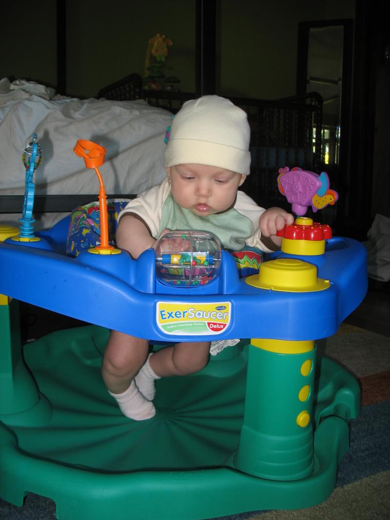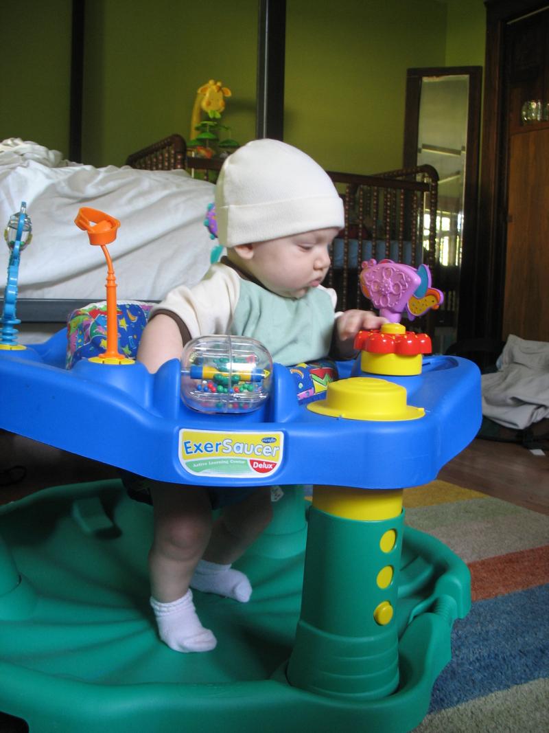 Well, perhaps not a look of delight, but considered studiousness on Nico's part here. He loves the exer saucer. He bounces and slaps his arms to make it go up and down. He hasn't quite figured out to push that yellow button on top of the red ring, but he can spin the beads like nobody's business.