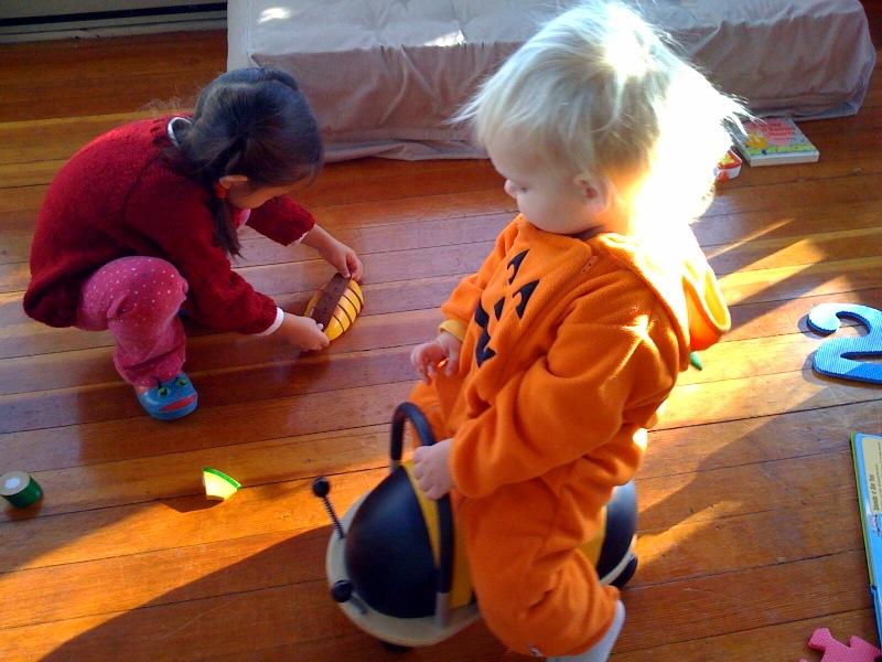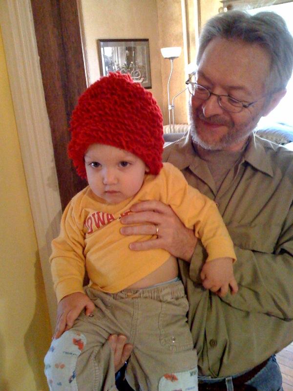 Nico tries on Aunt Josephine's hat under Grandpa Nutting's supervision