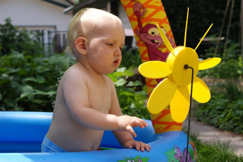 On Mama's birthday, we were playing out in the pool when she suddenly realized the cake she was making (yes, Mama made her own cake on her birthday - BAD Daddy, BAD) needed to come out of the oven so she rushed inside and took the first corner a bit too fast for the conditions (namely wet feet on linoleum) and feel on top of her foot.