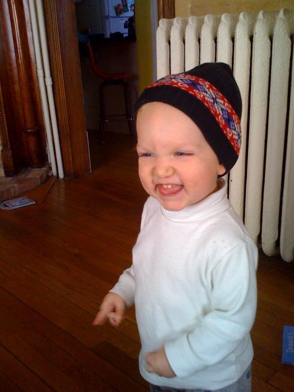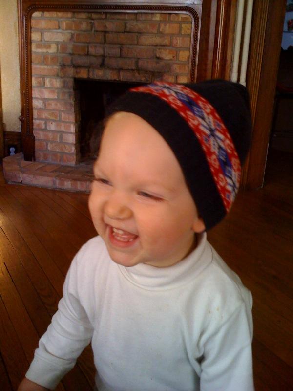 Nico with a Peace Coffee hat & knitted blanket (Thanks again Betsy!)