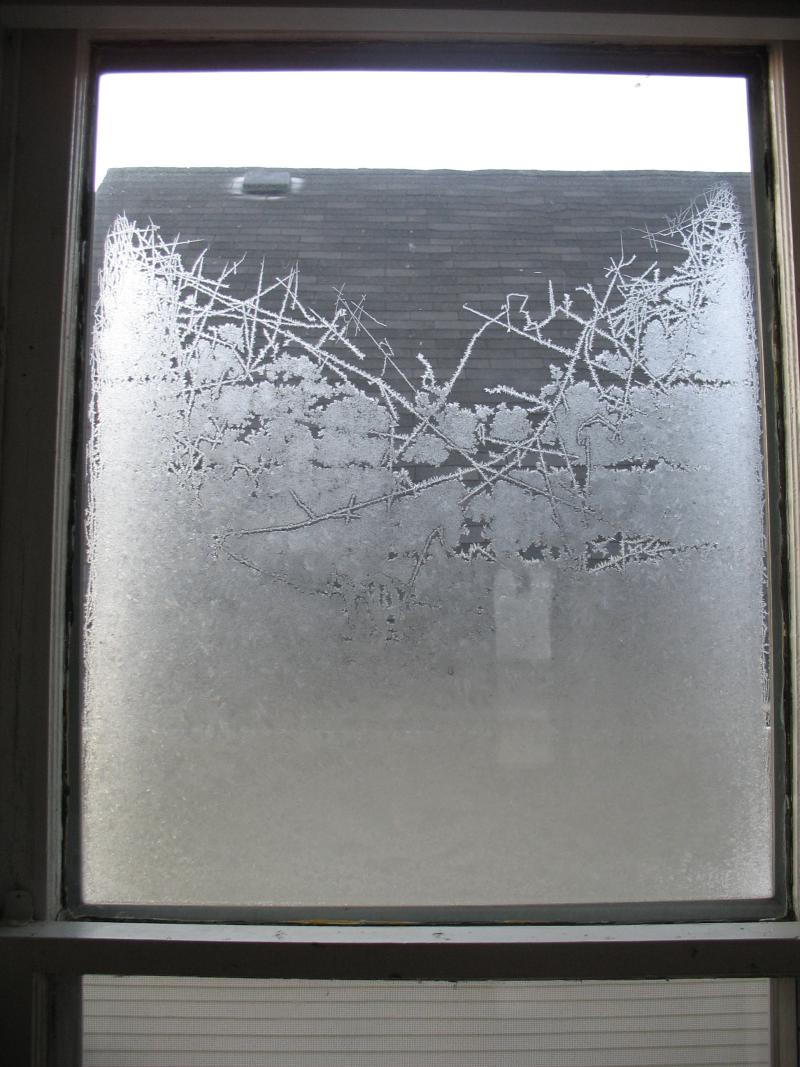 Frost designs in the bedroom windows courtesy of Mother Nature