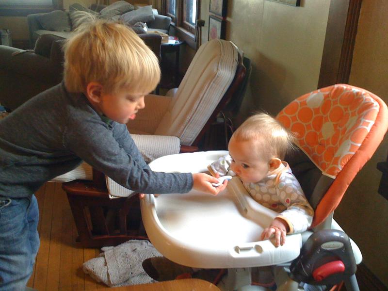 Big brother feeds his little sister