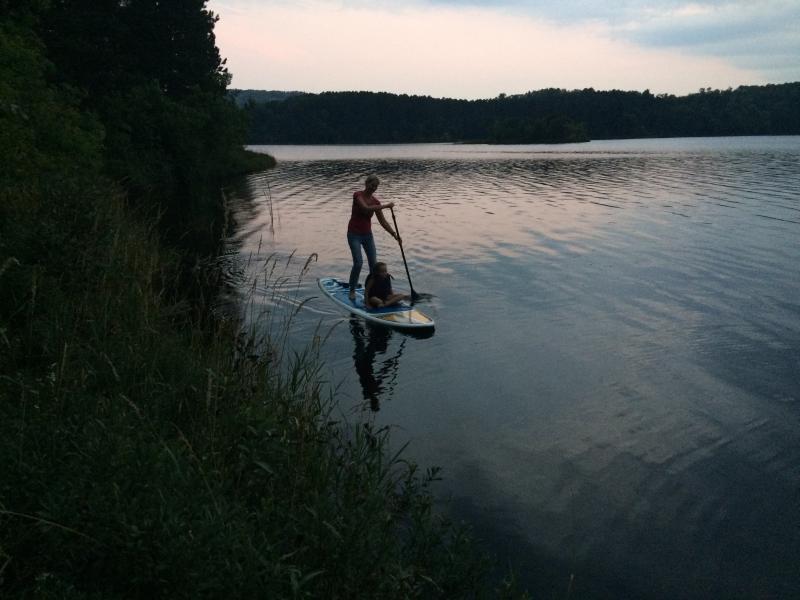 Jodi & Maya on a twilight paddle board