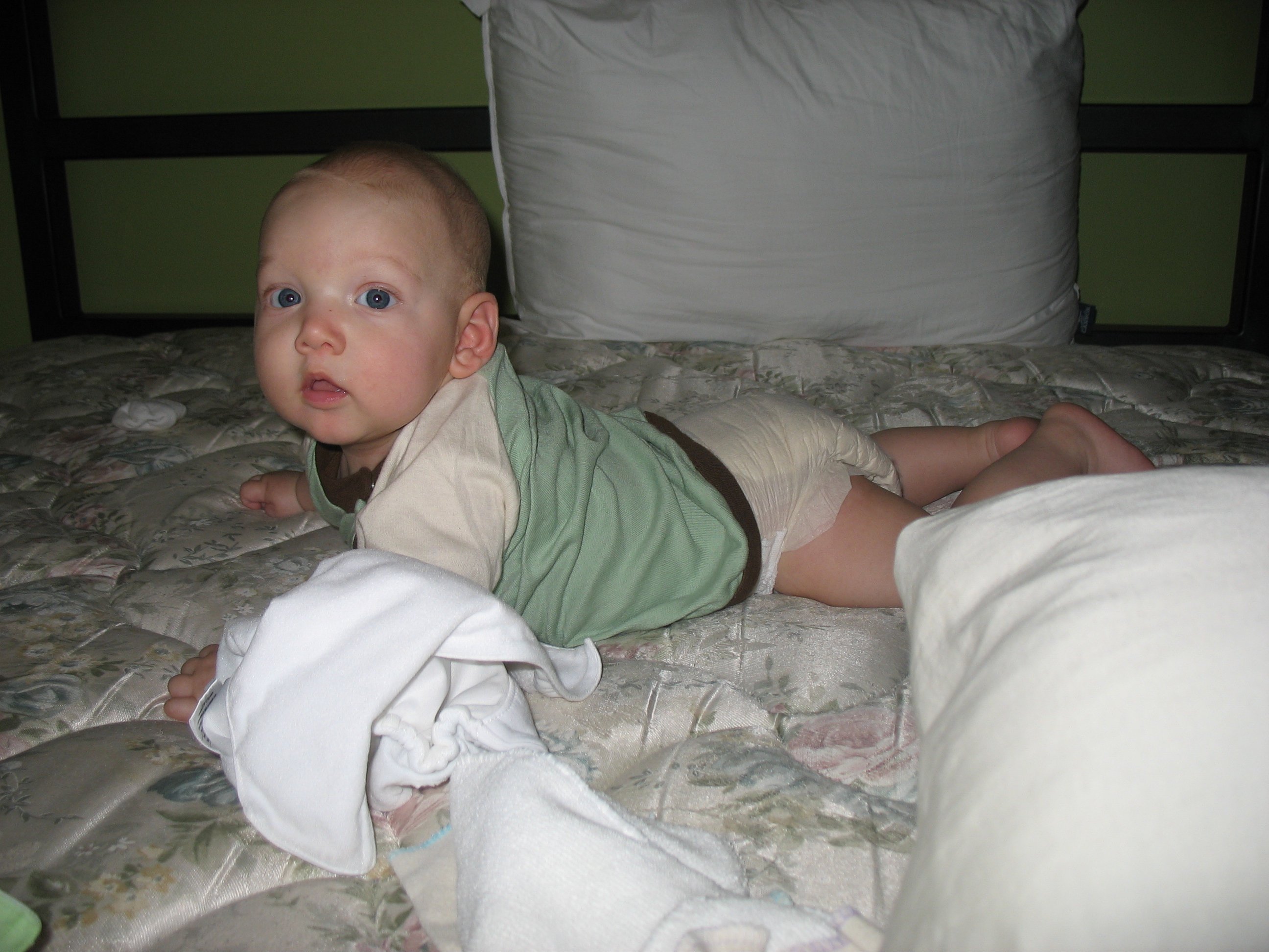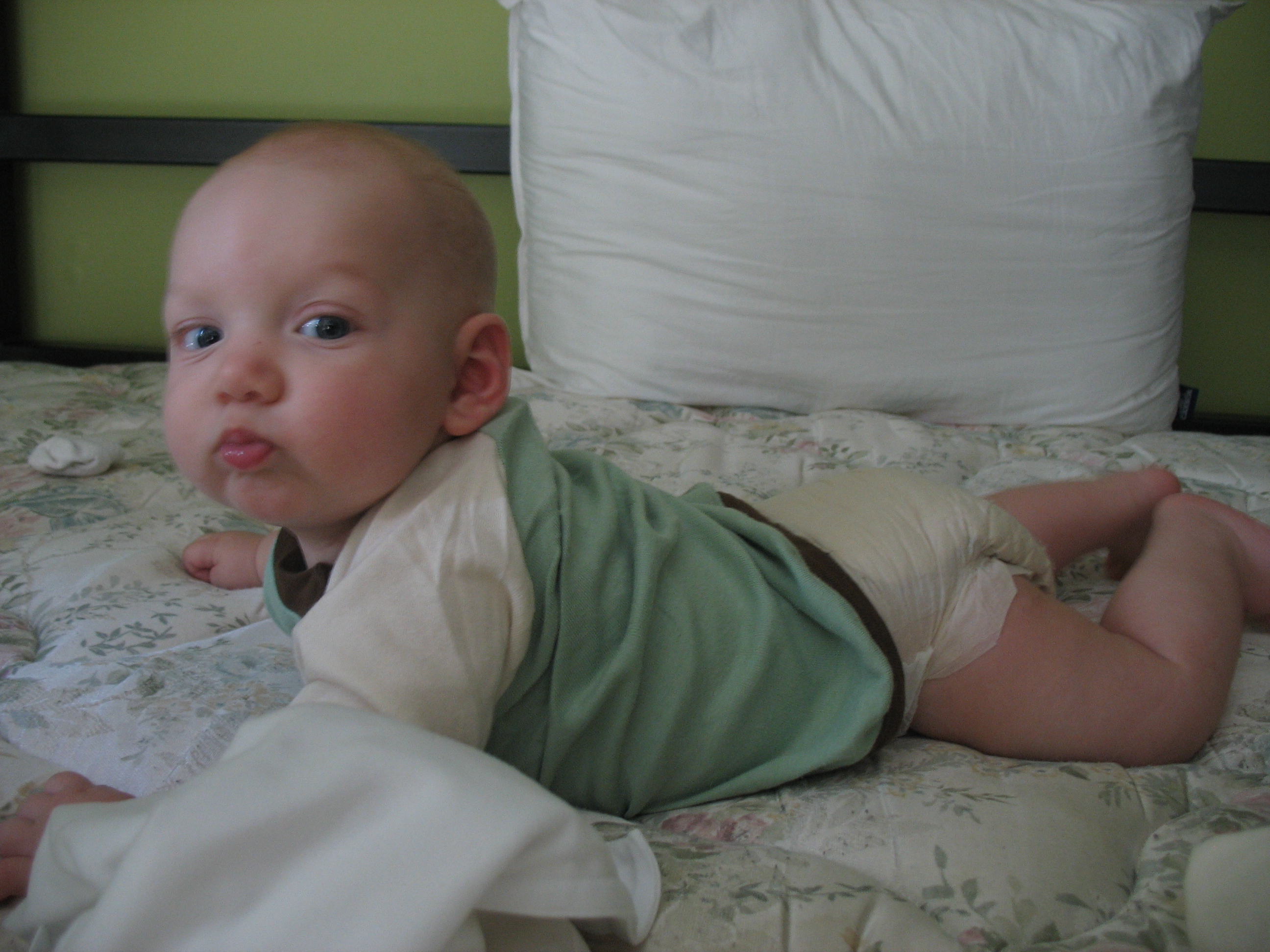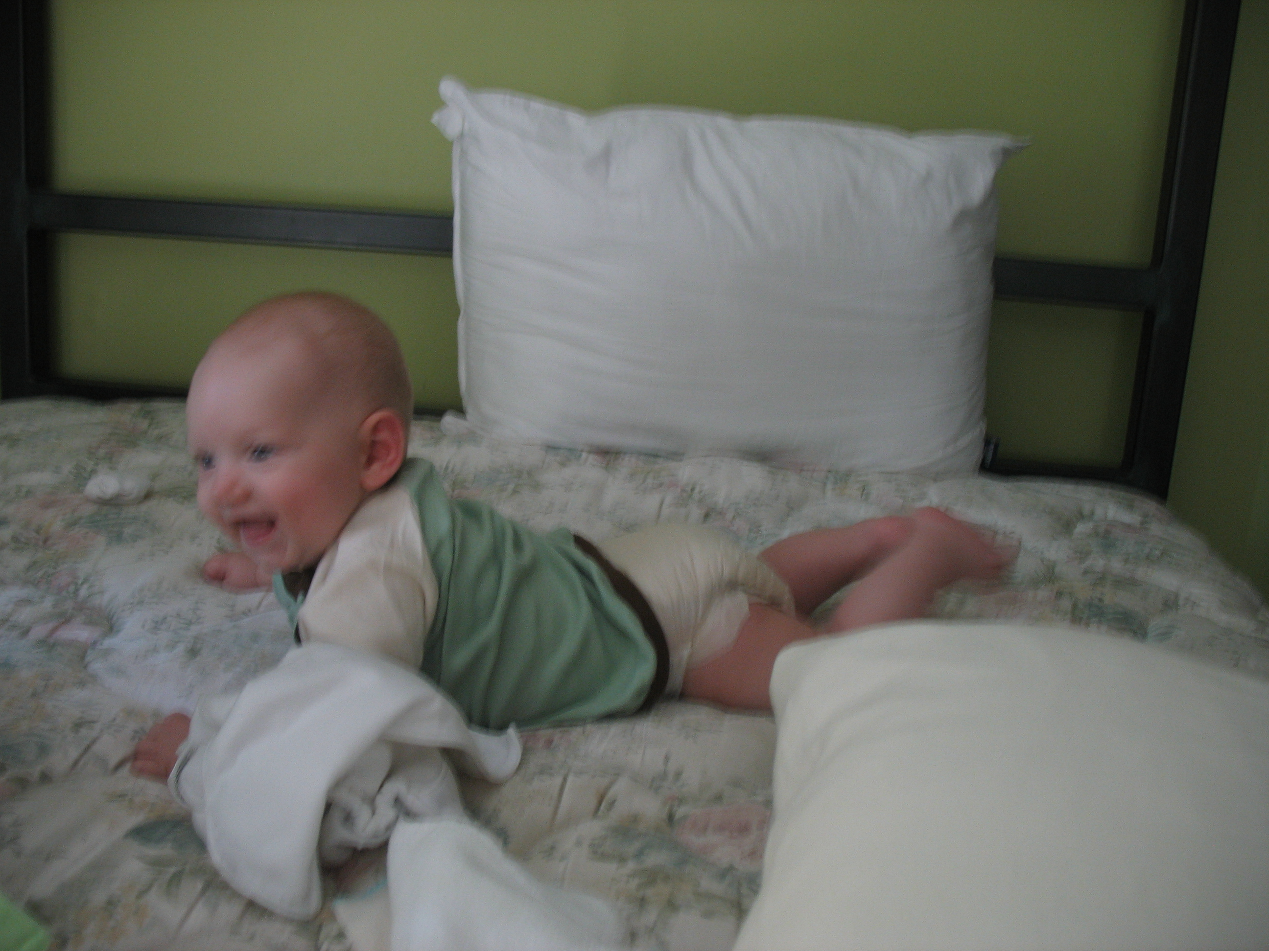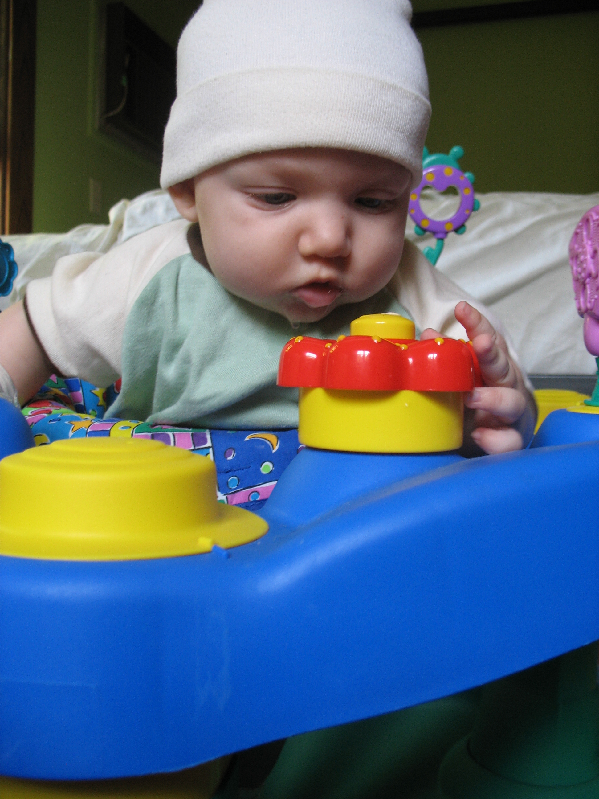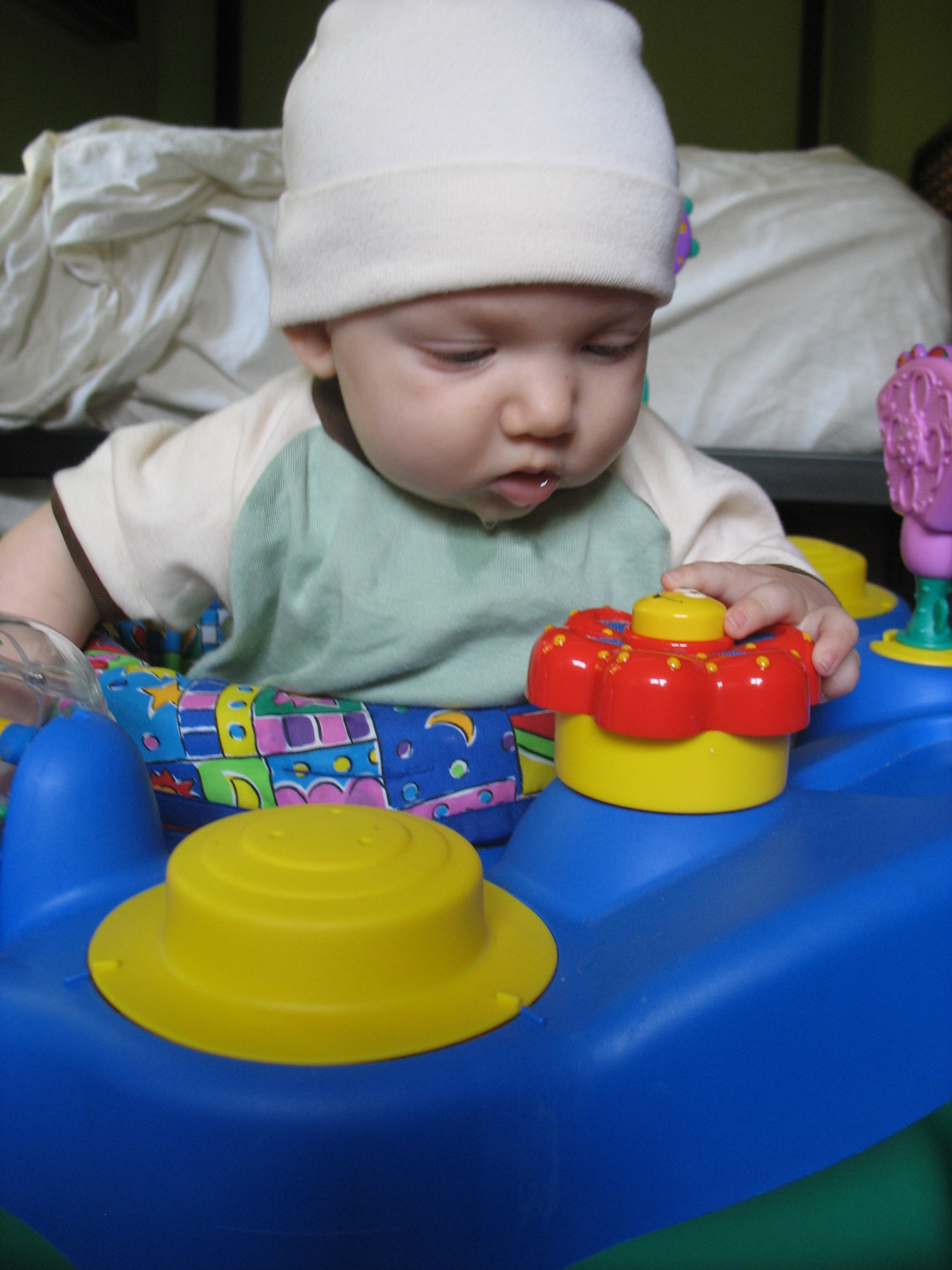 Well, perhaps not a look of delight, but considered studiousness on Nico's part here. He loves the exer saucer. He bounces and slaps his arms to make it go up and down. He hasn't quite figured out to push that yellow button on top of the red ring, but he can spin the beads like nobody's business.