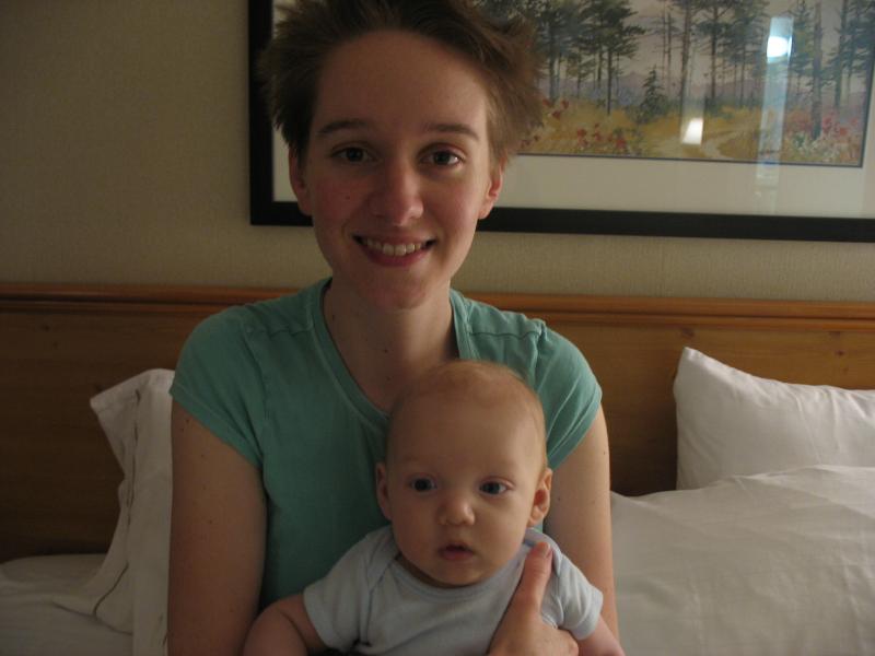 We're in Rhinelander, Wisconsin for cousin Sarah and Matt's wedding. This is Nico's first trip out of state. Took 6 or so hours to get here, with a couple feeding stops, a lunch stop, and a trip to the mall in Wausau to find something for Mama to wear (ugh). Nico was powerless against the hypnotic rhythm of the highway and slept the entire time. Boy was he happy to stretch out on the king size bed when we got to the hotel!