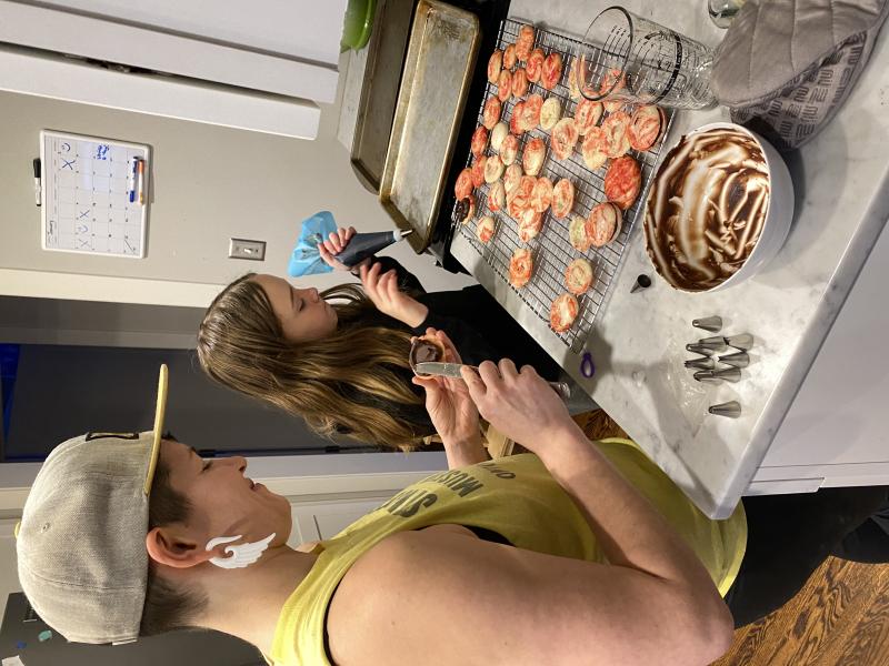 Maya and Christie made peppermint macarons with a chocolate ganache filling