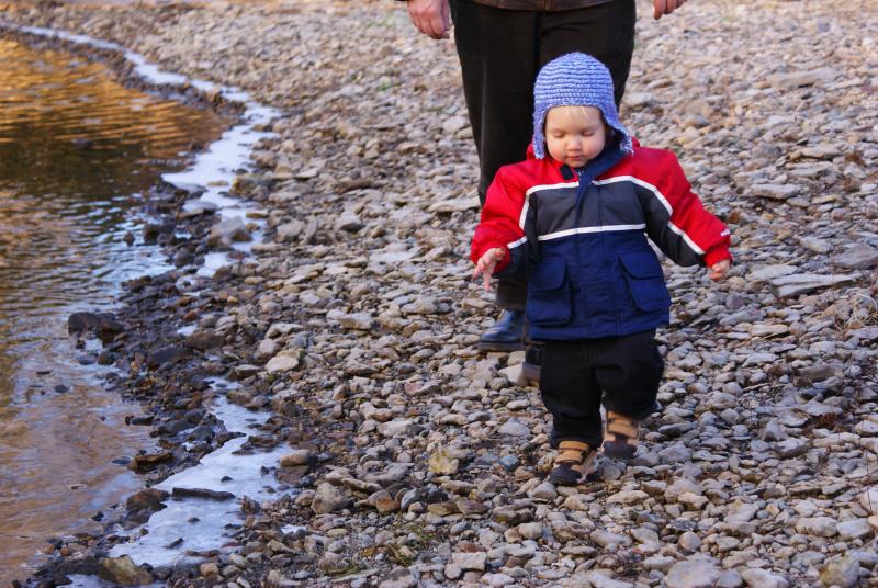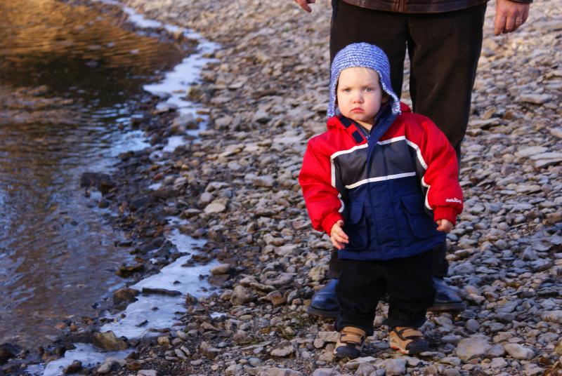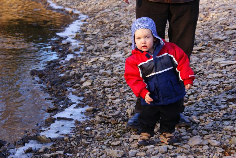 Nico tosses a rock into the Zumbro River behind Grandma Nutting's house
