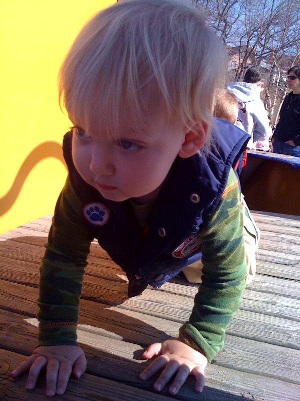 This afternoon, Nico and Daddy went to the tot lot for the first time this season. Apparently, Nico played on every single implement there, and would have stayed there all afternoon and evening if it was up to him. Unfortunately, Daddy eventually got hungry, so they had to come home.