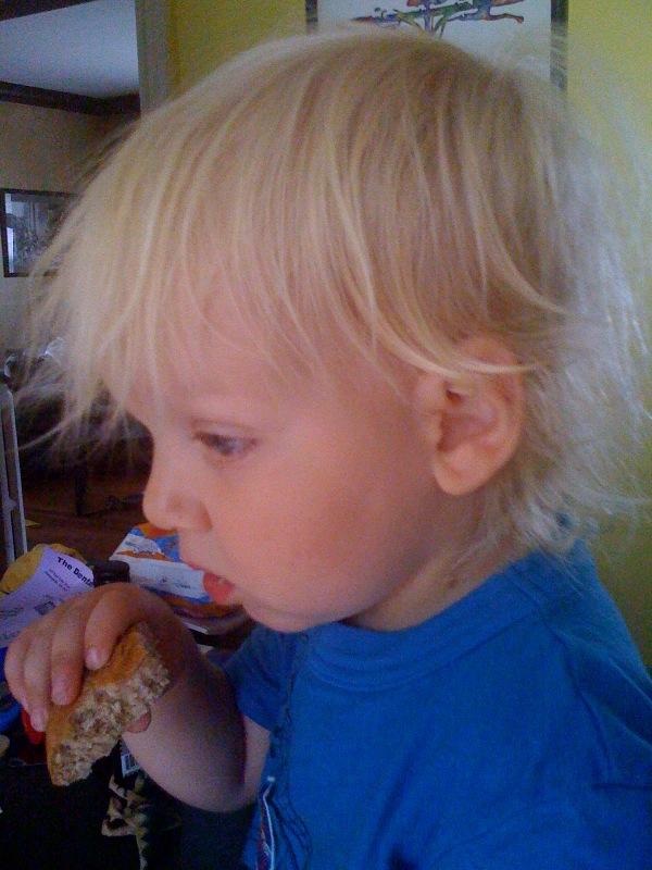 Up from a nap, eating a bun