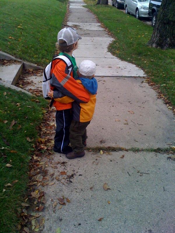 Hug as bus approaches