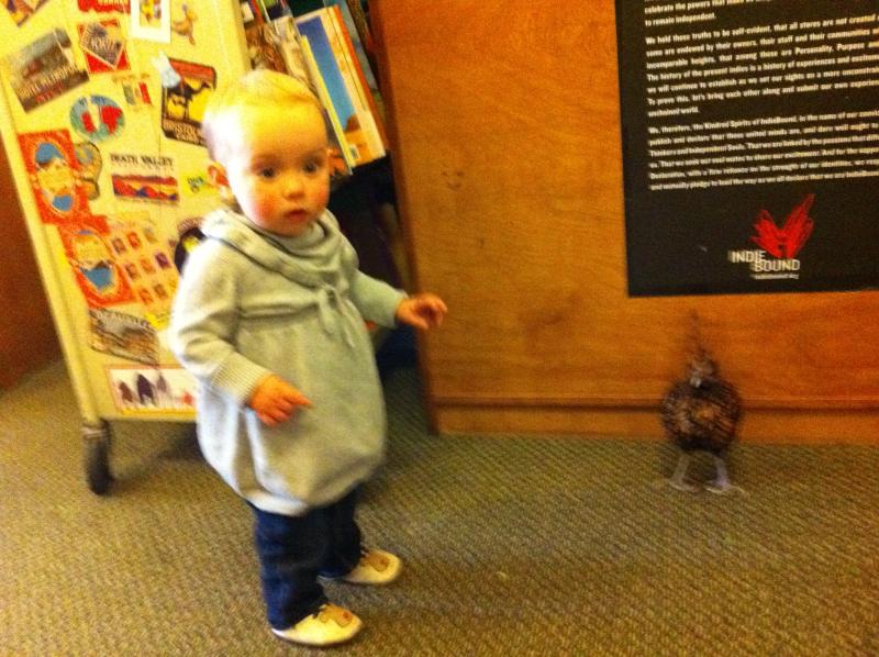 Maya half-heartedly tried to reach out and touch the chickens, but mostly would just laugh as she extended her arm and then pull it quickly back. But she chased them all around the store - including behind the register.