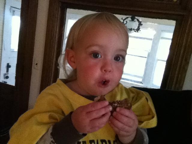 Wearing Daddy's shirt, eating ANOTHER pancake
