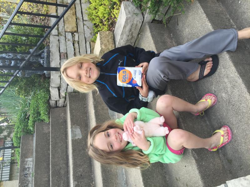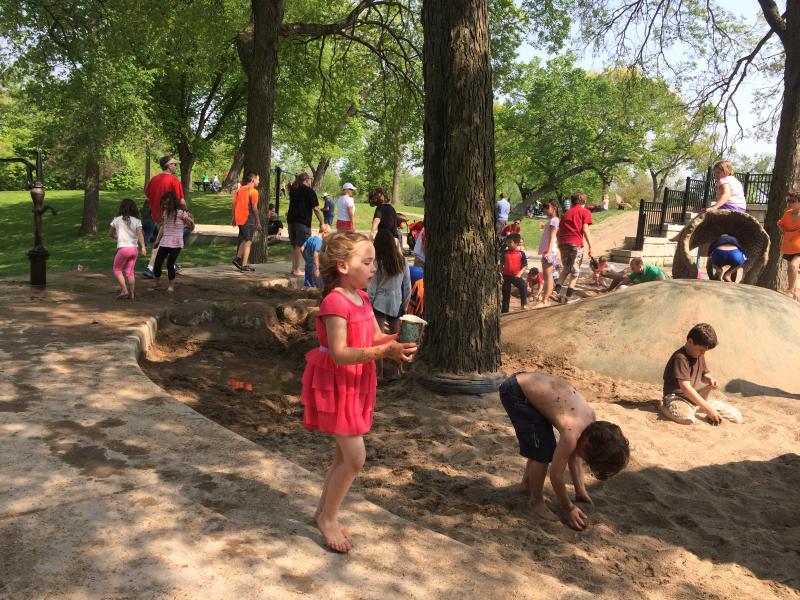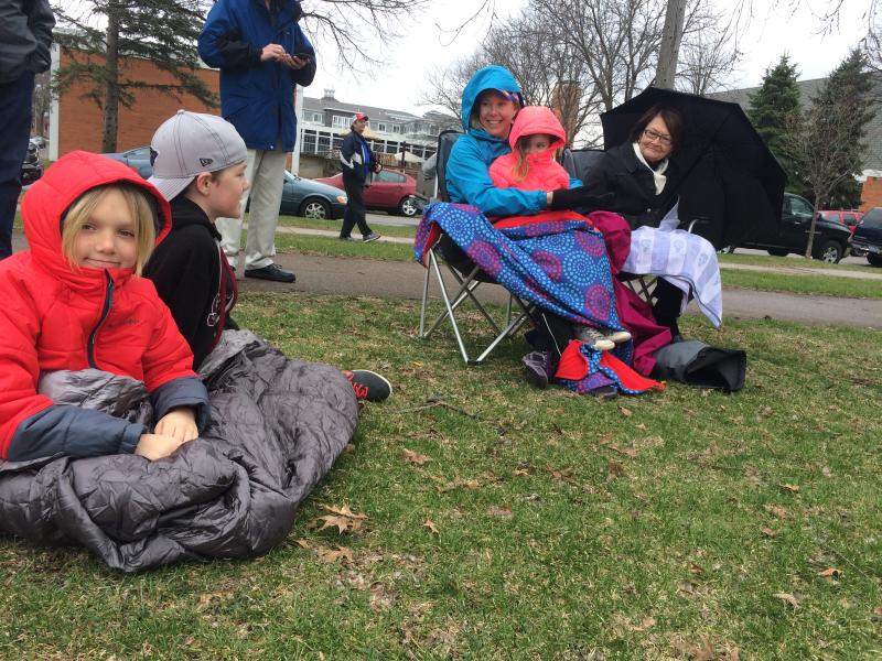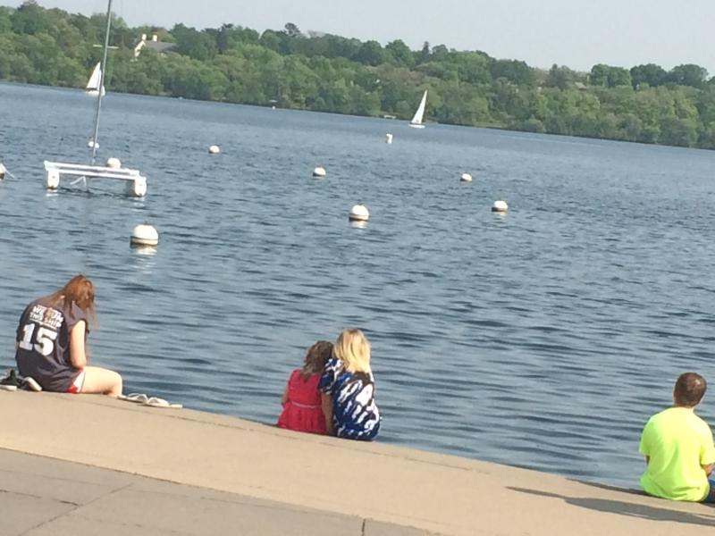 Daddy waits in line while kids precariously hangout at the edge of the lake