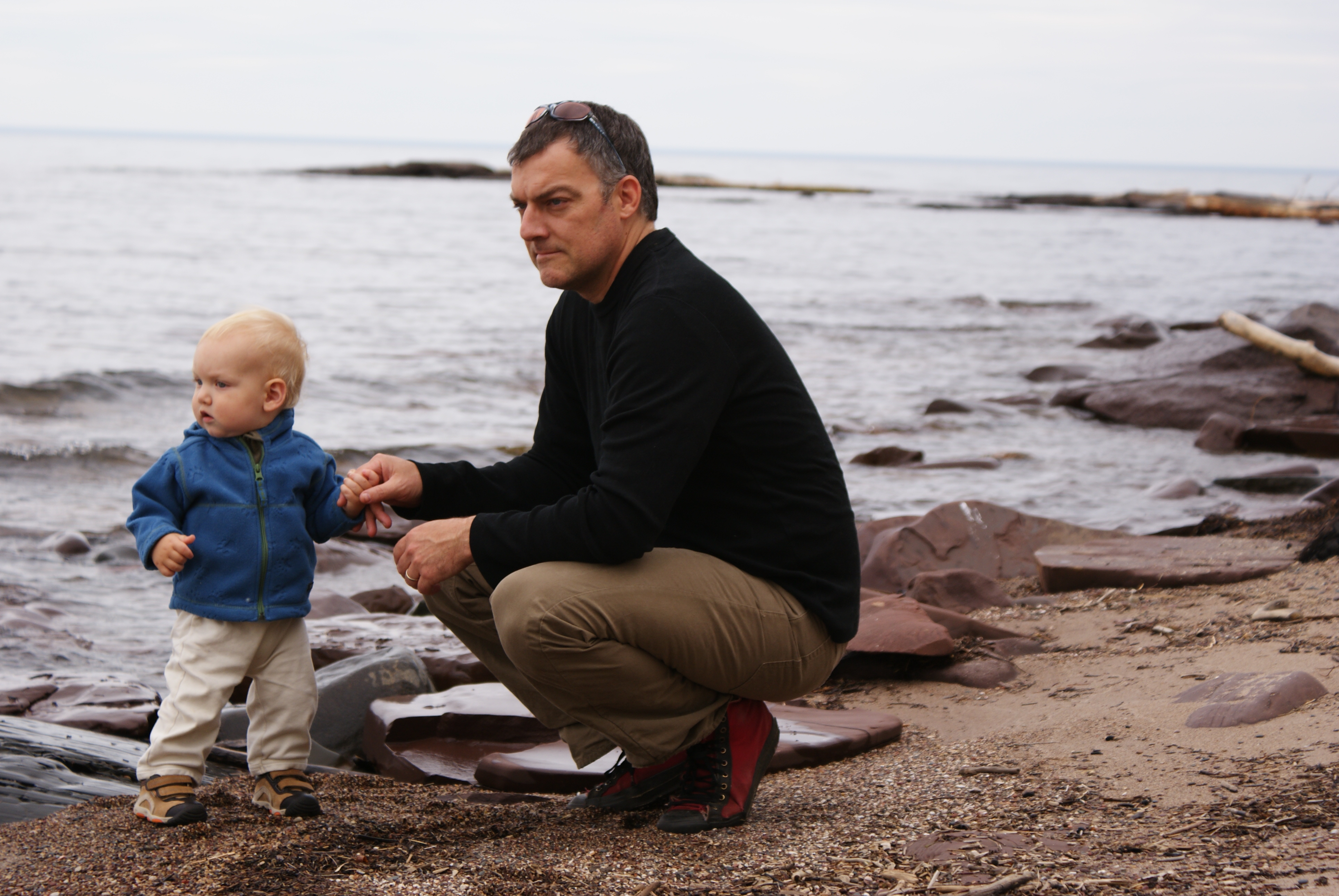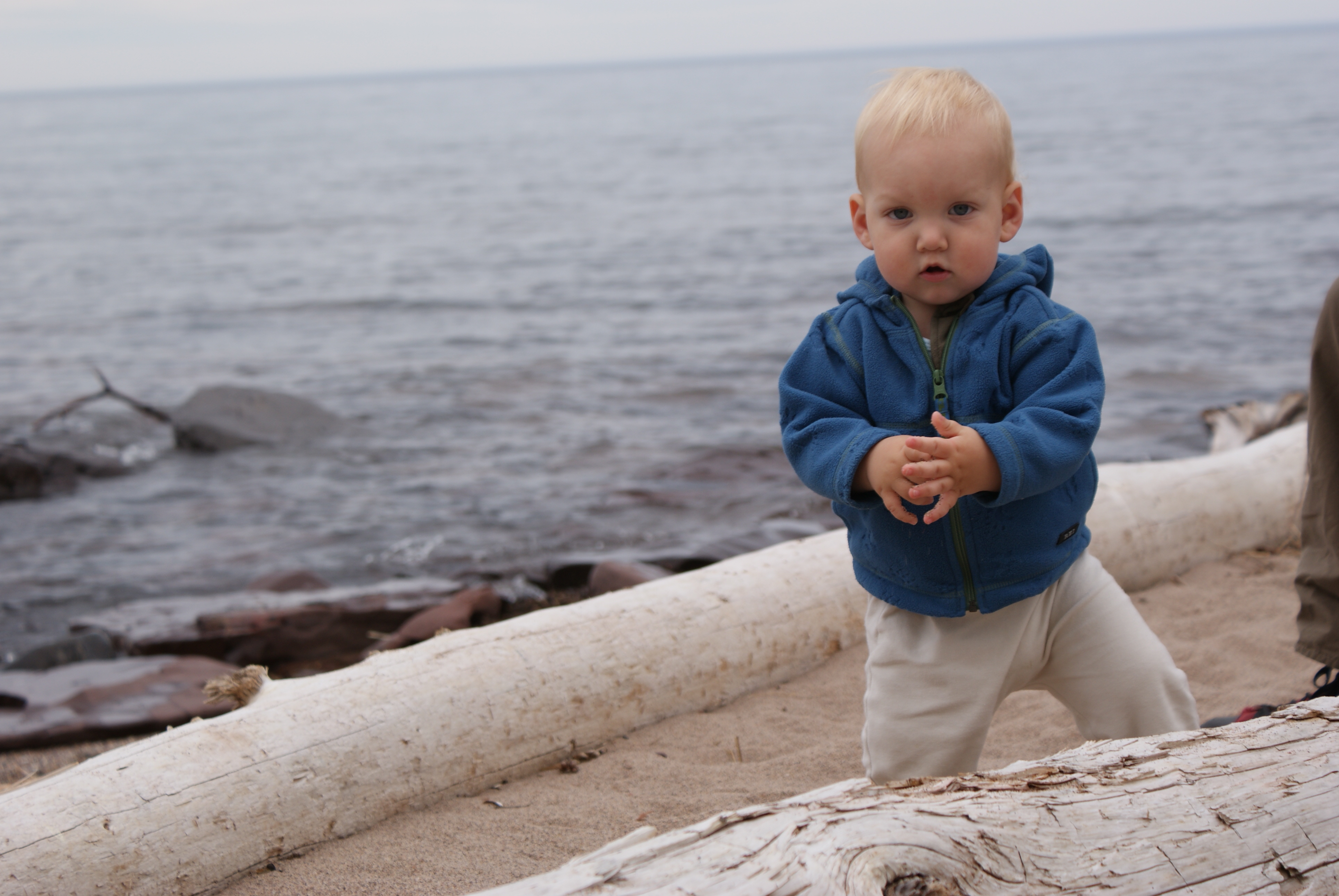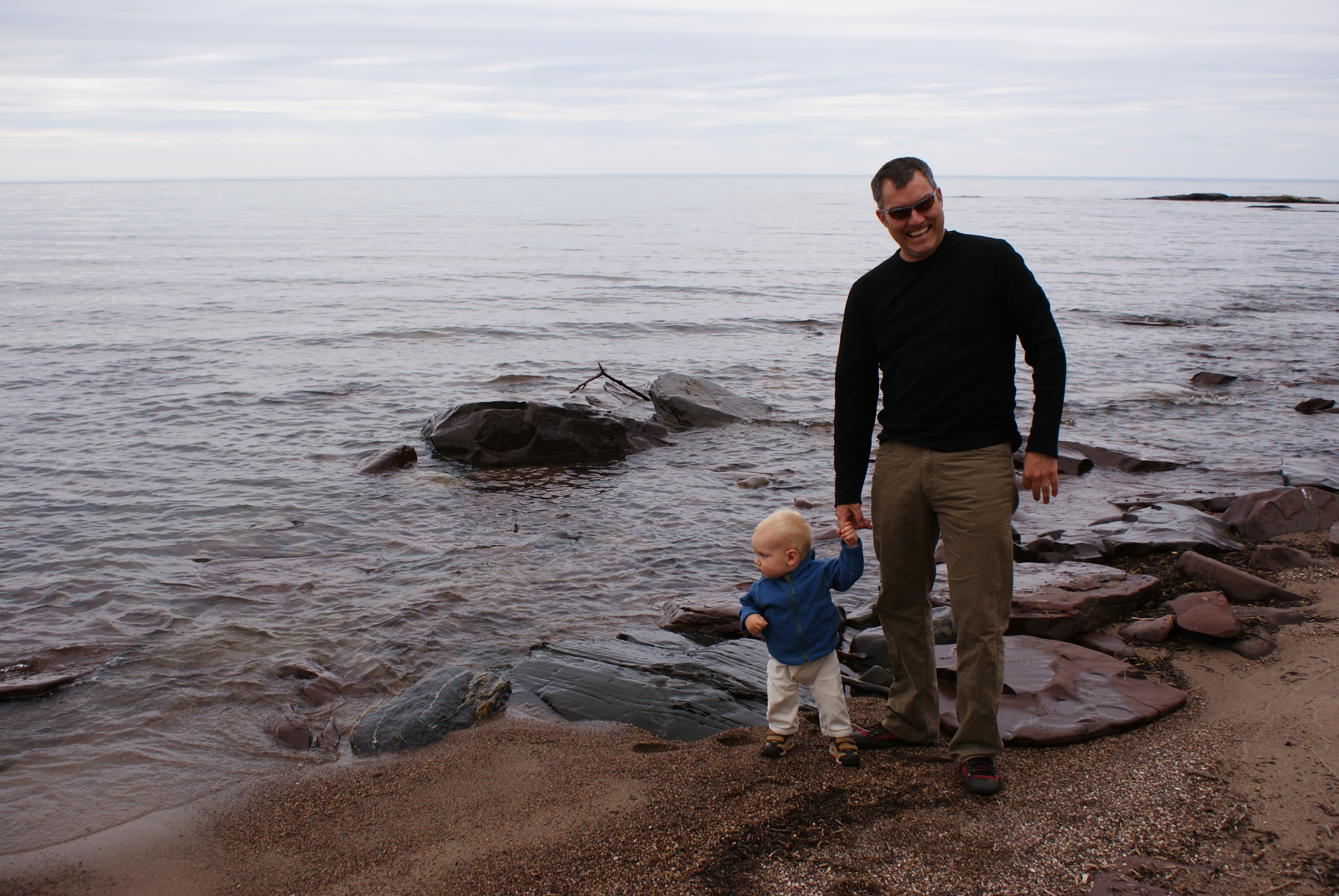Here we are on the first day of our two week vacation. That's Lake Superior in the background. Nico was enthralled with the waves and wanted to run into the lake. At over 900 feet deep, probably not a good idea.