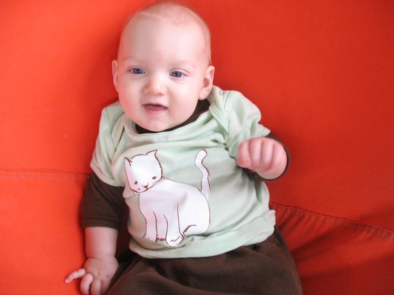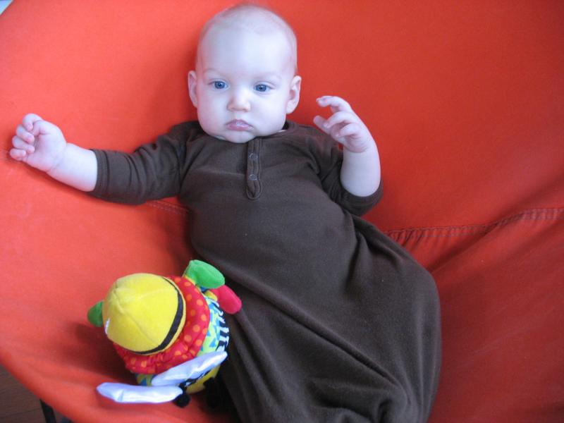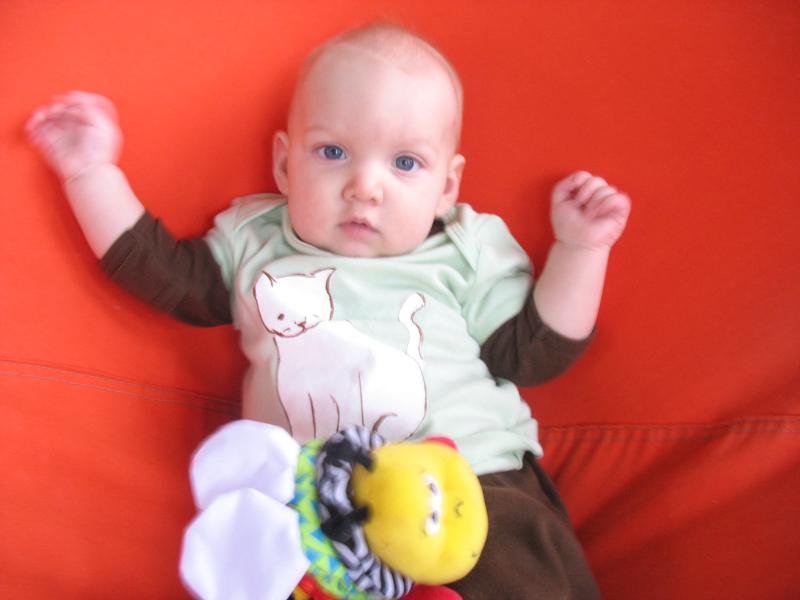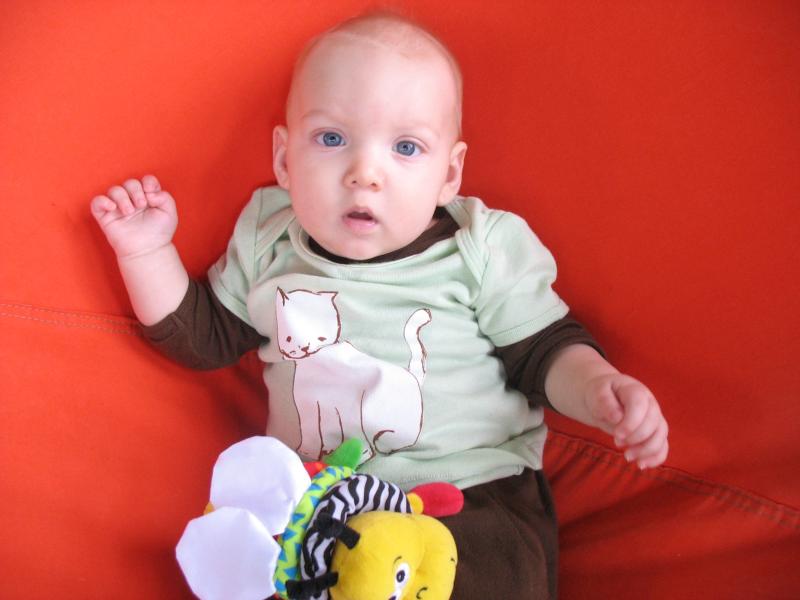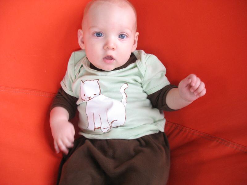 This is the chair that Nico was sitting in today when we fed him his first spoonfuls of rice cereal (mostly mixed with milk). He was fairly into it, everything he touches goes into his mouth, so the fact he grabbed it and was interested in putting into his mouth isn't too astounding. He did swallow a dozen or so spoonfuls - the spoon is tiny and it was more like a spoon dipped in rice cereal than a full spoon.