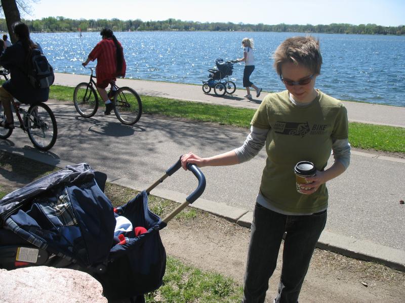 Lots going on around Lake Calhoun with bikers, other strollers, and a wind surfer or two off in the distance.