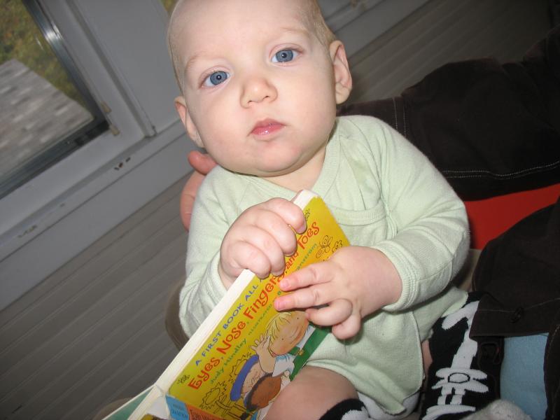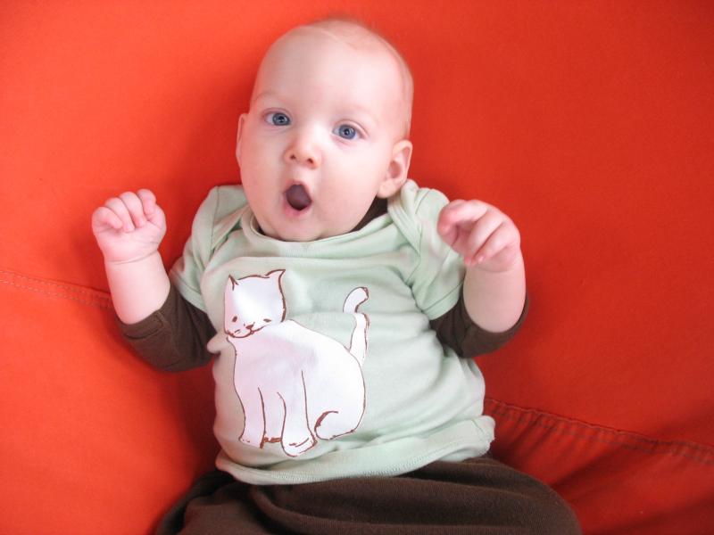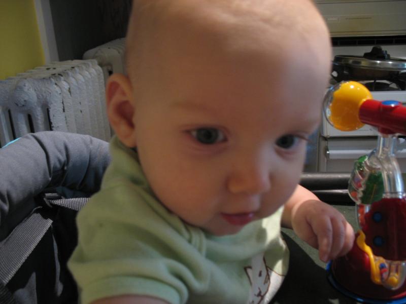 This is the chair that Nico was sitting in today when we fed him his first spoonfuls of rice cereal (mostly mixed with milk). He was fairly into it, everything he touches goes into his mouth, so the fact he grabbed it and was interested in putting into his mouth isn't too astounding. He did swallow a dozen or so spoonfuls - the spoon is tiny and it was more like a spoon dipped in rice cereal than a full spoon.