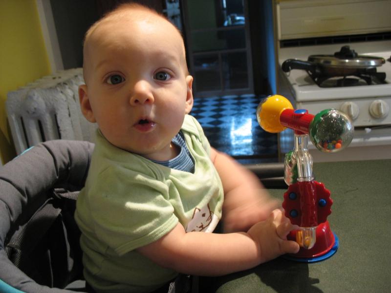 This is the chair that Nico was sitting in today when we fed him his first spoonfuls of rice cereal (mostly mixed with milk). He was fairly into it, everything he touches goes into his mouth, so the fact he grabbed it and was interested in putting into his mouth isn't too astounding. He did swallow a dozen or so spoonfuls - the spoon is tiny and it was more like a spoon dipped in rice cereal than a full spoon.