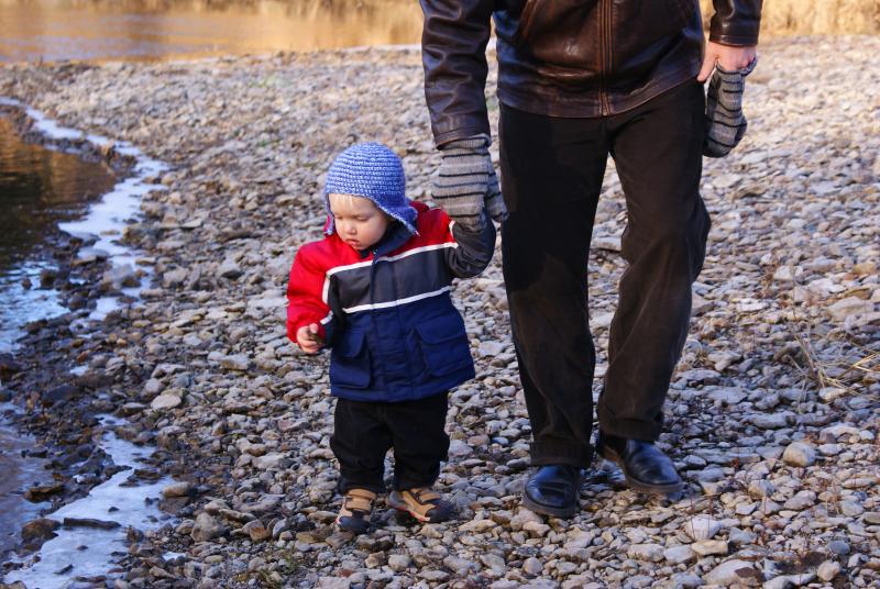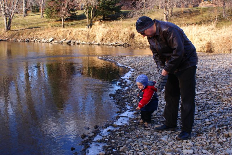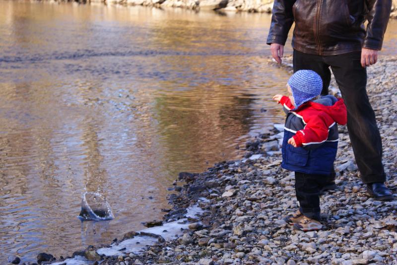 Nico tosses a rock into the Zumbro River behind Grandma Nutting's house