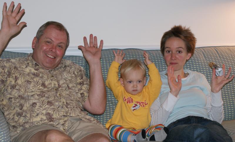 Nico participates in the wave with Gramps and Mama