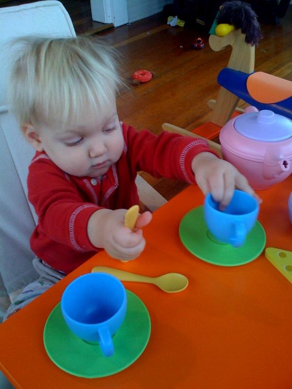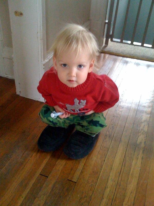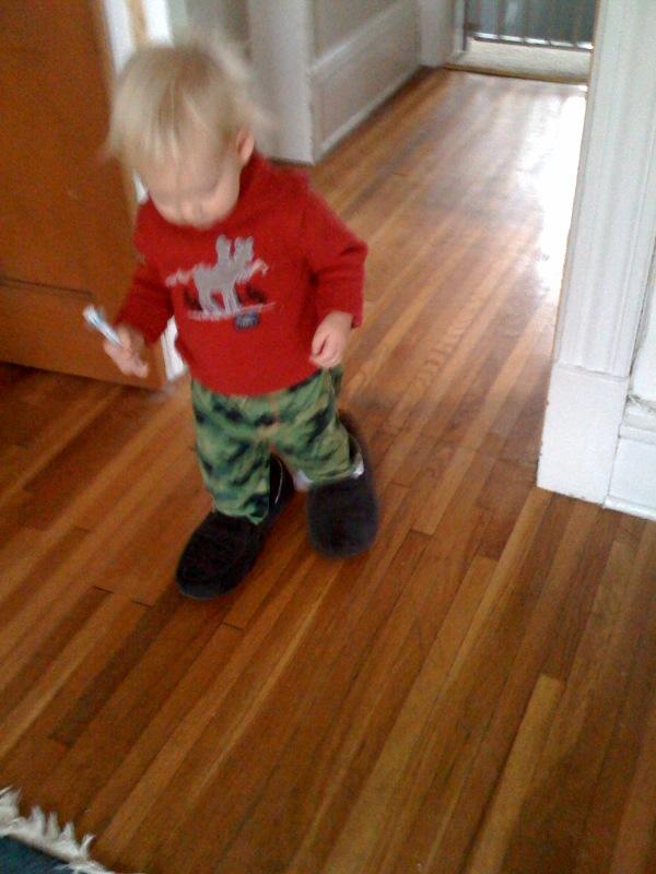 Nico walks in Daddy's shoes for awhile (well, slippers)