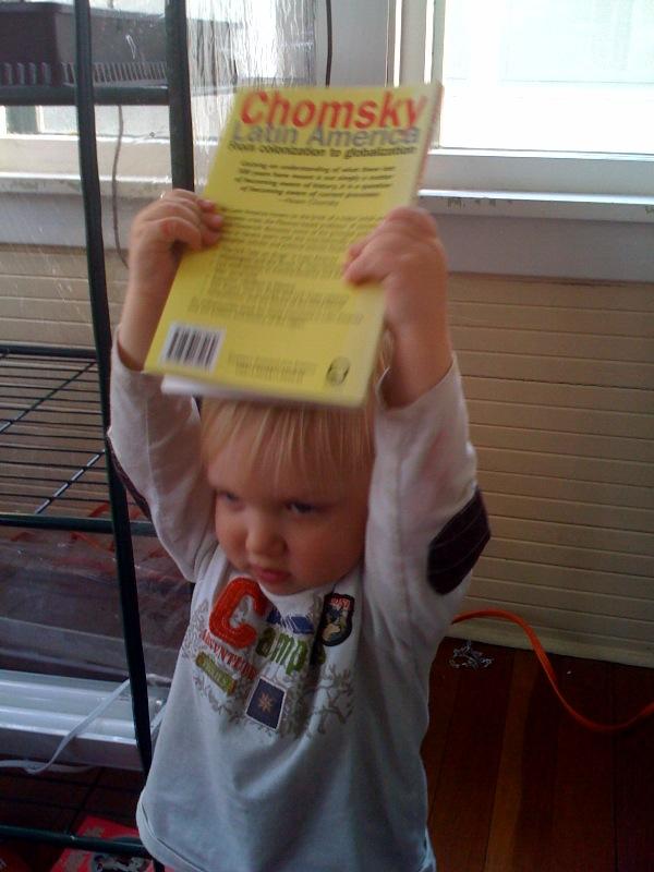 Nico holds Chomsky up high, just like Daddy