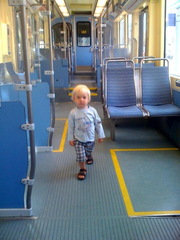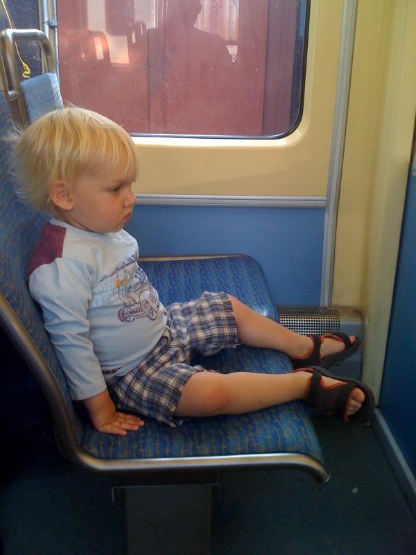 Wiping the sleep from his eyes while waving goodbye to Grammy