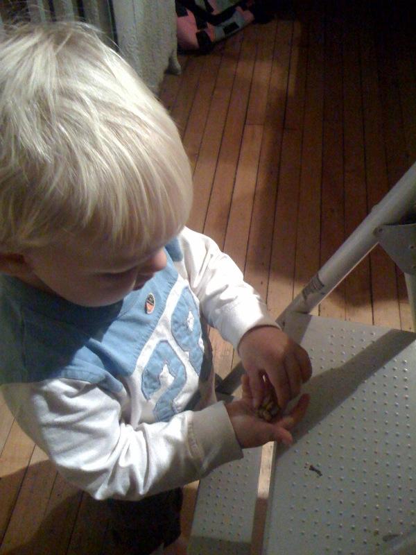 Carefully placing "eggs" (dry beans) into the "nest" (a flake of cereal)