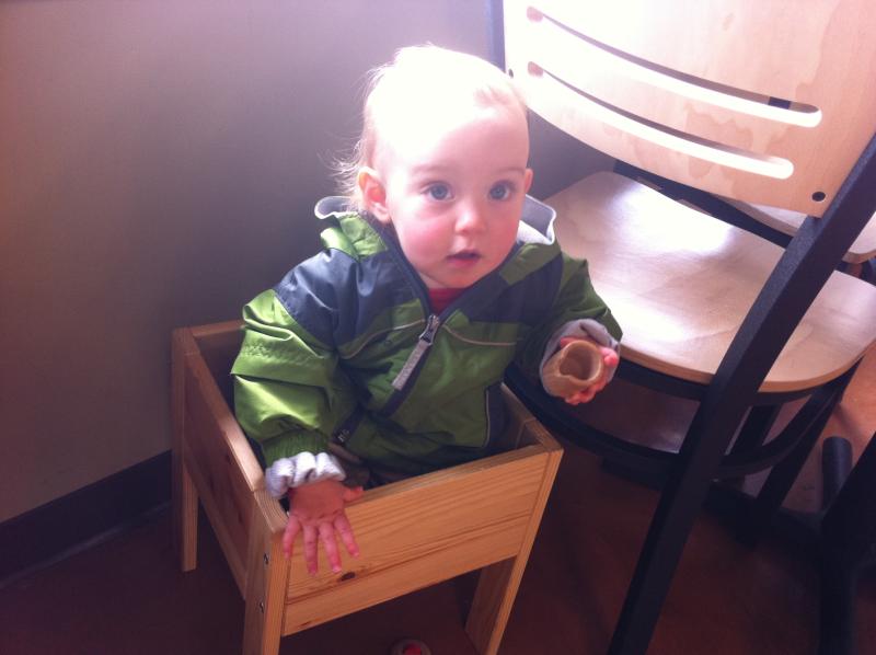 Maya half-heartedly tried to reach out and touch the chickens, but mostly would just laugh as she extended her arm and then pull it quickly back. But she chased them all around the store - including behind the register.
