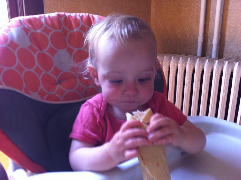 Cheerios. Maya looked completely comfortable and happy. When I said