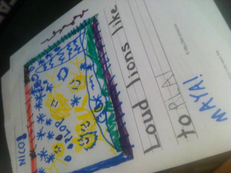 Nico also pointed out to me how the top left lion was sad because he didn't get to play. The lion to the top right is the Daddy lion, and he's "watching closely".