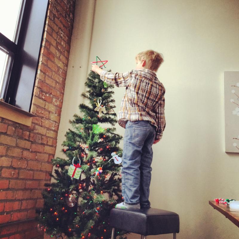 Putting the finishing touches on the Christmas tree