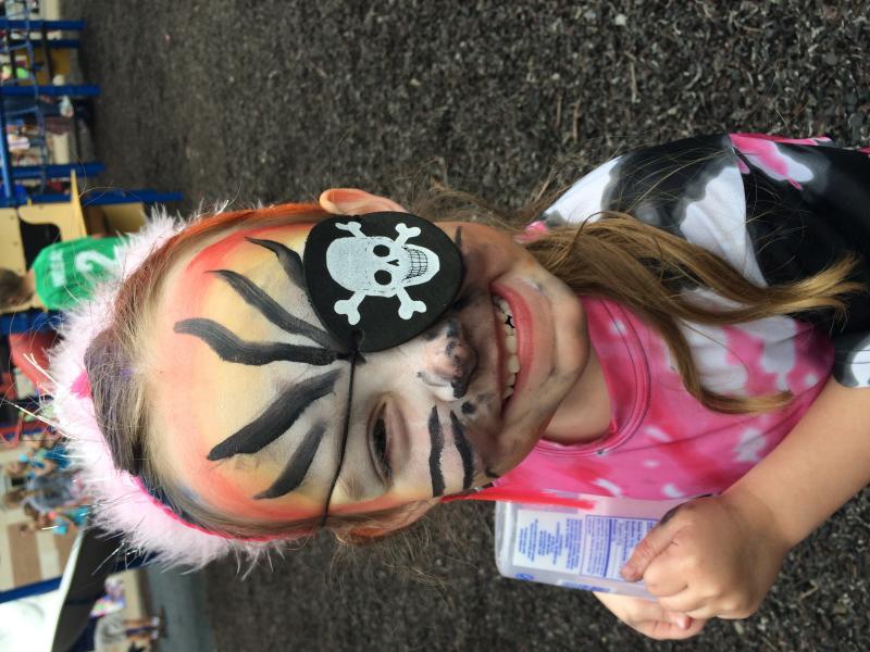 Hilarious! Maya totally cracked me up on this one. A) The waaaaay over done Tiger Princess gig, but then she sees this pirate eye patch on the ground. She looks up at me and I gave her the I don't care shrug. She picks it up and slaps it on. I chuckled and asked for a picture and after two fake smiles, she gives me this "Arrrgggghhh" with a growl and a good fist pump for exclamation! Too funny! This was way late in the day, last half hour. We left just peak carnival. She was fun all day! My little Tiger Princess Pirate!