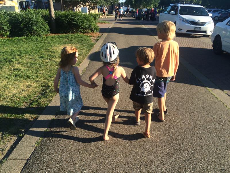 Linnea & Anders walking to ice cream