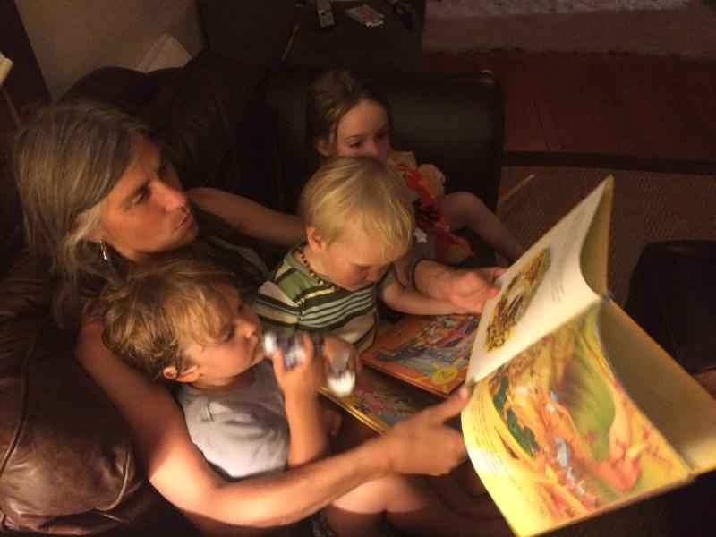 Lindsey reading to Anders, Basil & Maya