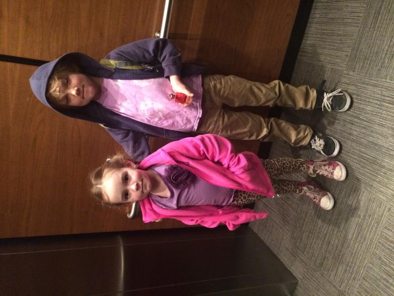 In the elevator, heading off to school
