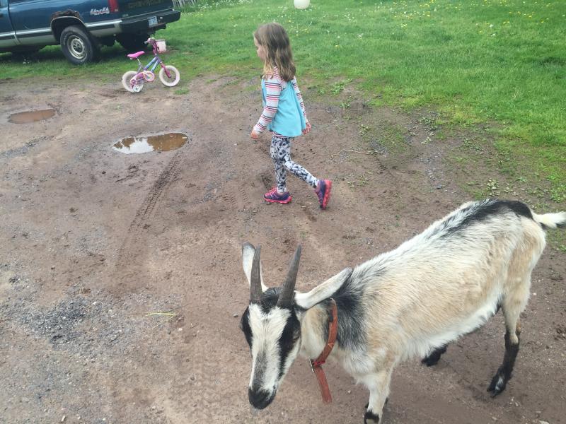 Maya and goat at Christie's mother's house in Michigan