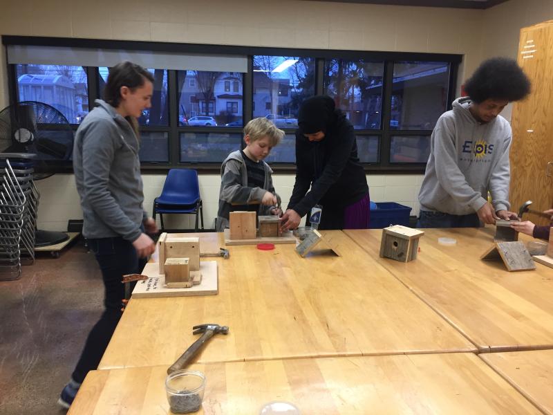 Maya hammers a nail into her birdhouse