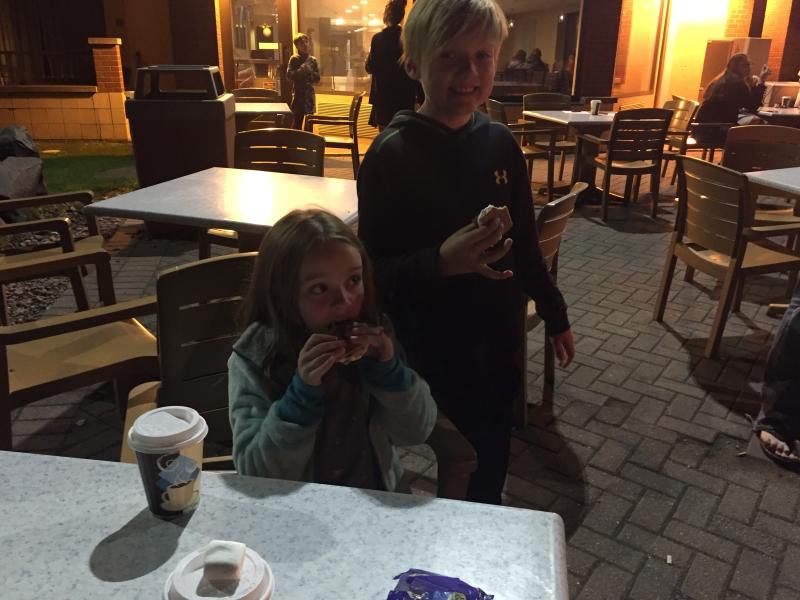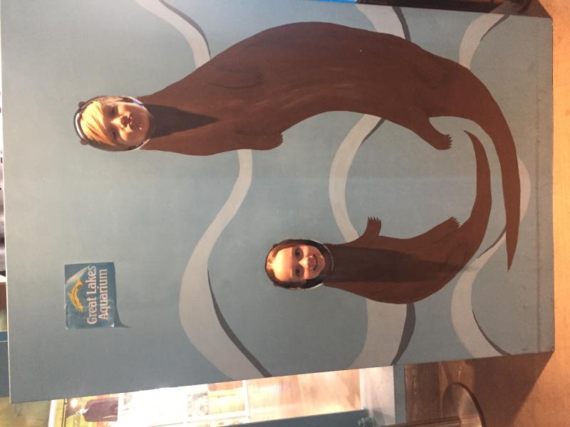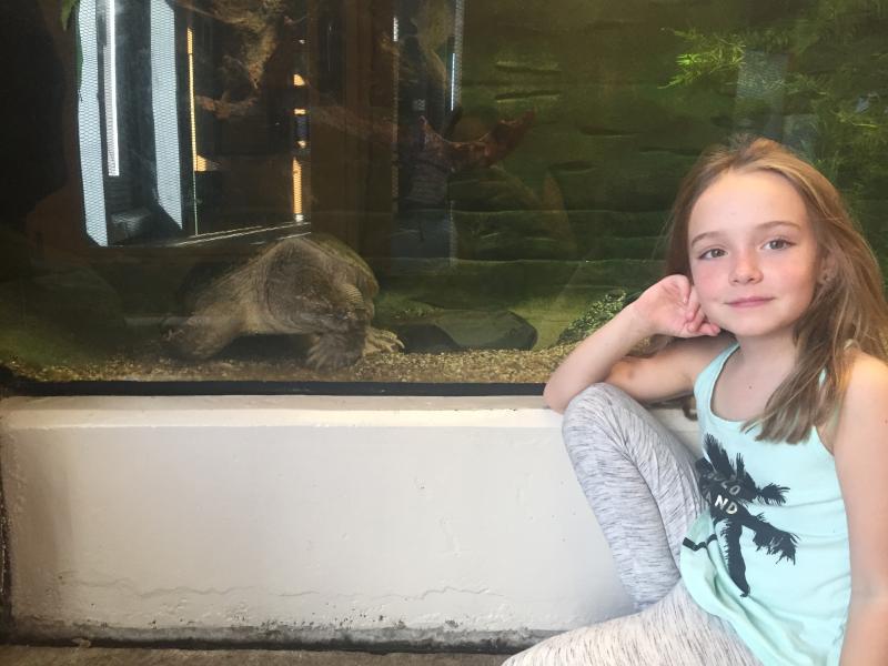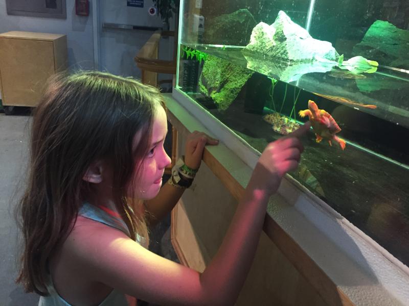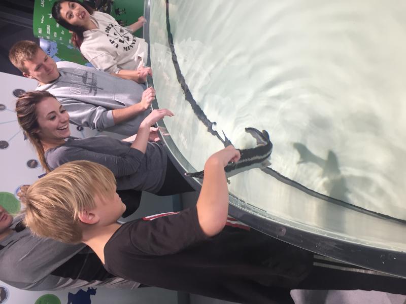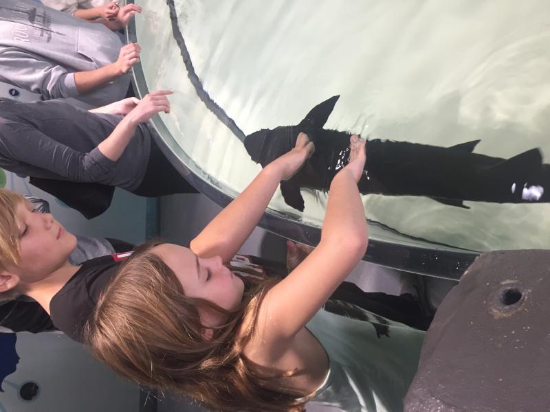 Nico petting Snowflake the sturgeon at the aquarium in Duluth