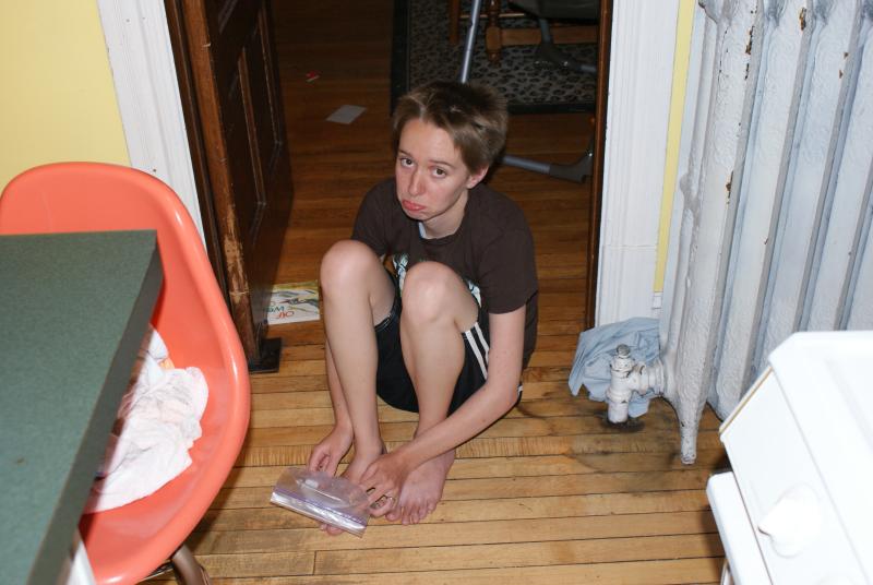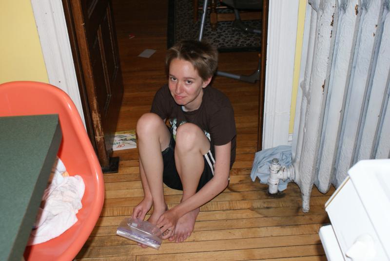 On Mama's birthday, we were playing out in the pool when she suddenly realized the cake she was making (yes, Mama made her own cake on her birthday - BAD Daddy, BAD) needed to come out of the oven so she rushed inside and took the first corner a bit too fast for the conditions (namely wet feet on linoleum) and feel on top of her foot.