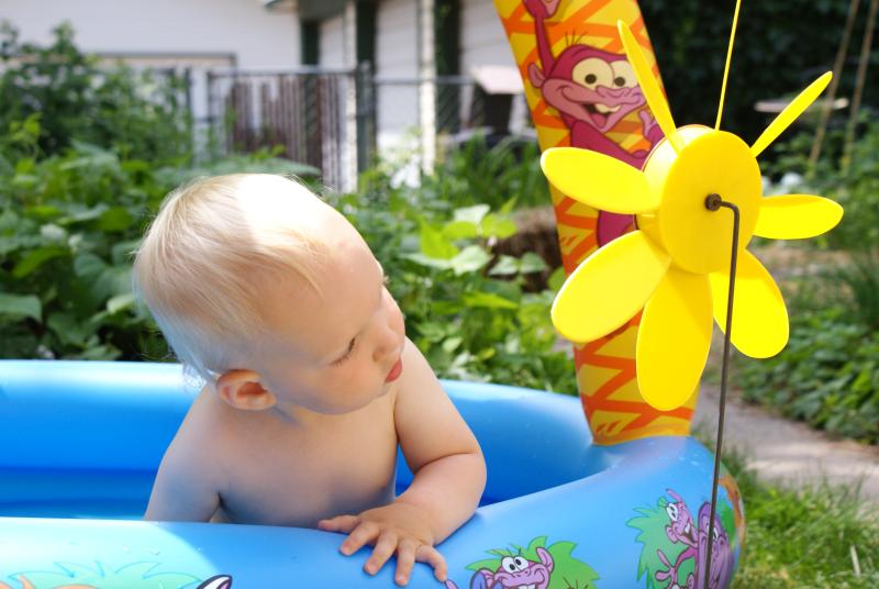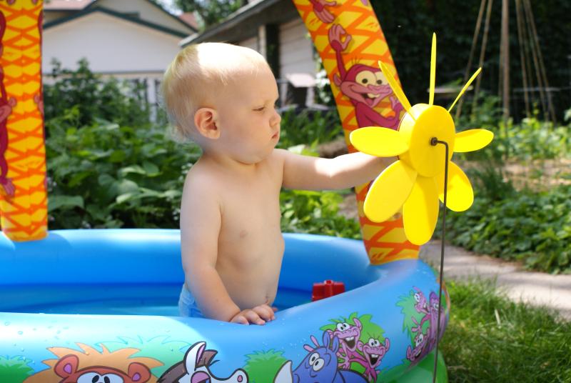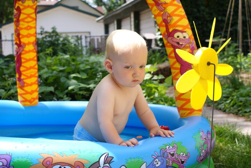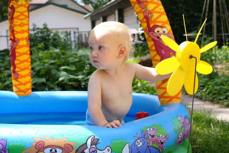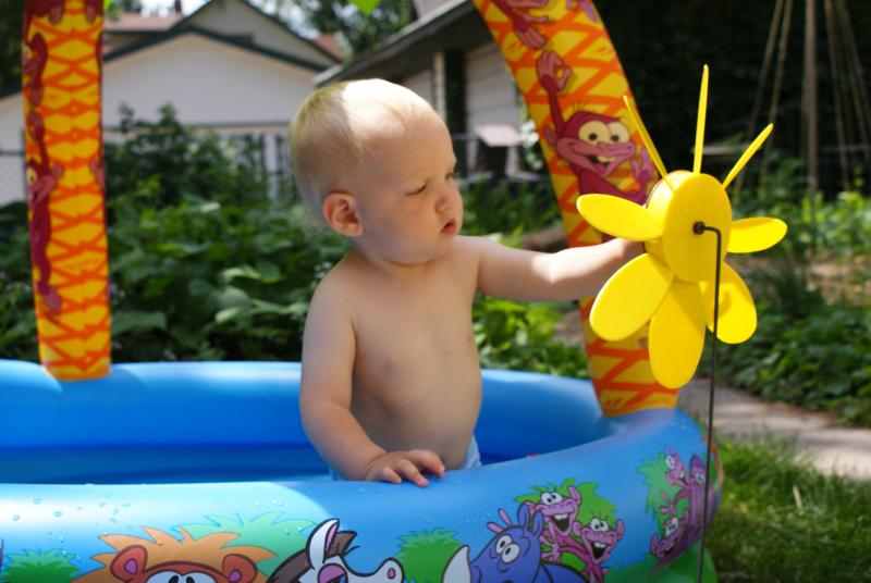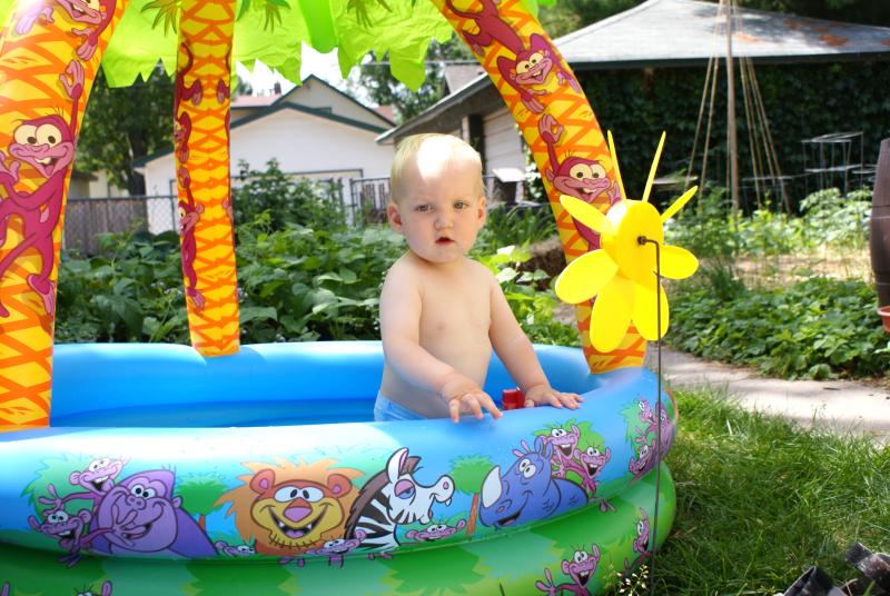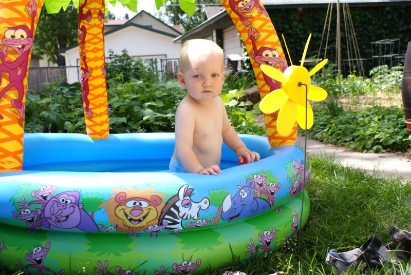 The pool is brand new. It was hot last week so we went to Target and splurged $20 on it. It has a little hose you can hook up so water flows like a shower through the top - kinda cool! It's been fun, we've used it 3 times already, Nico seems to like, Mama and Daddy love it!